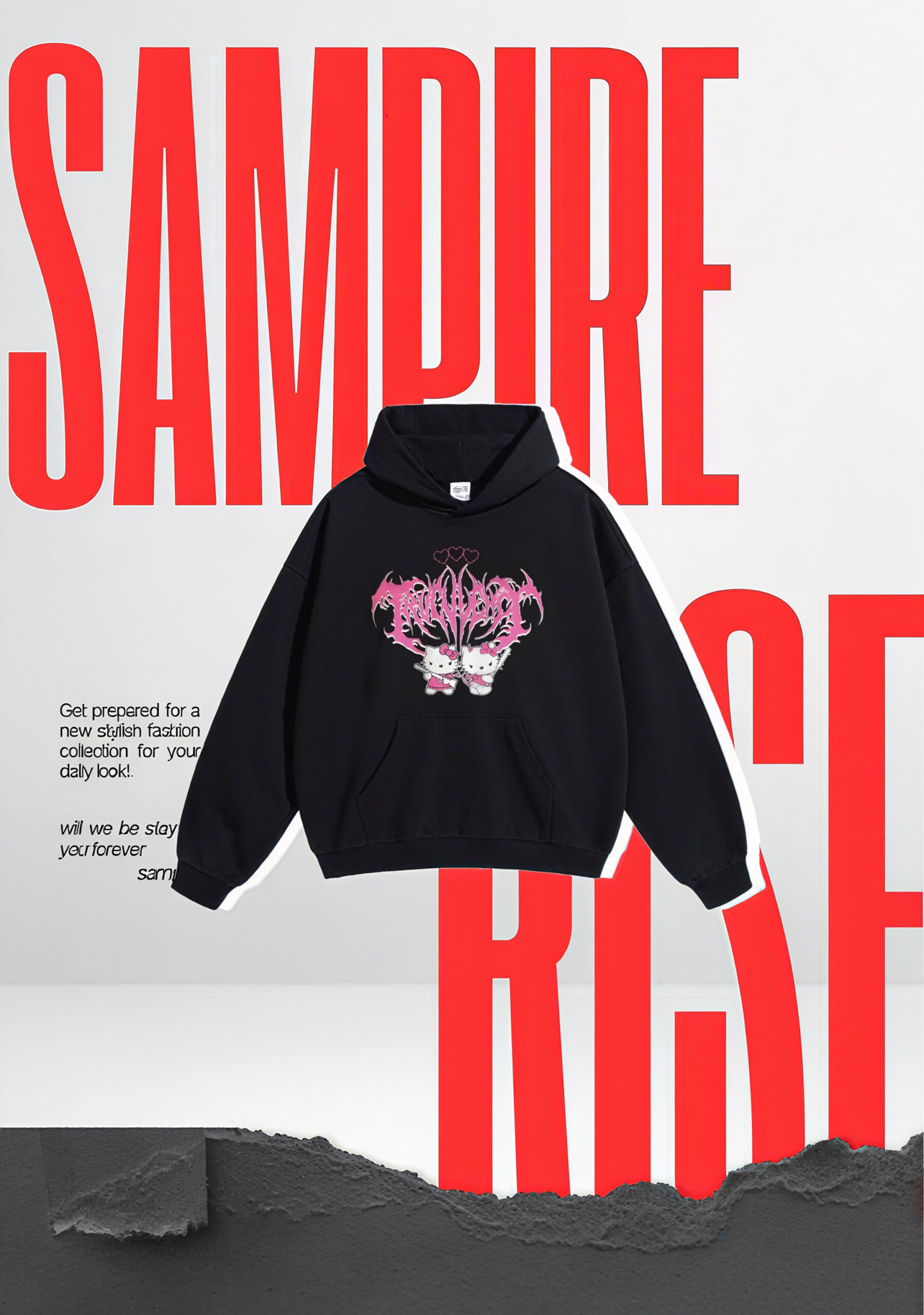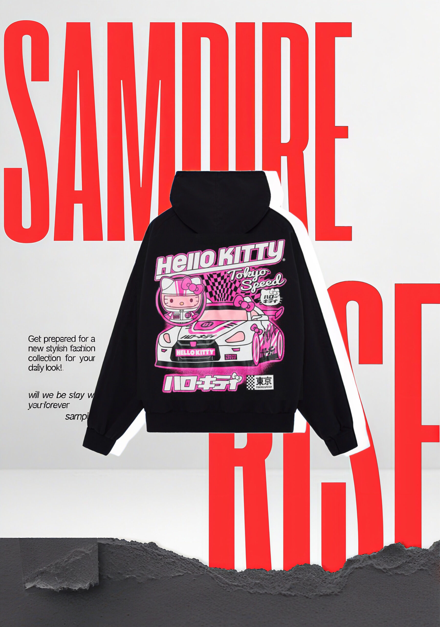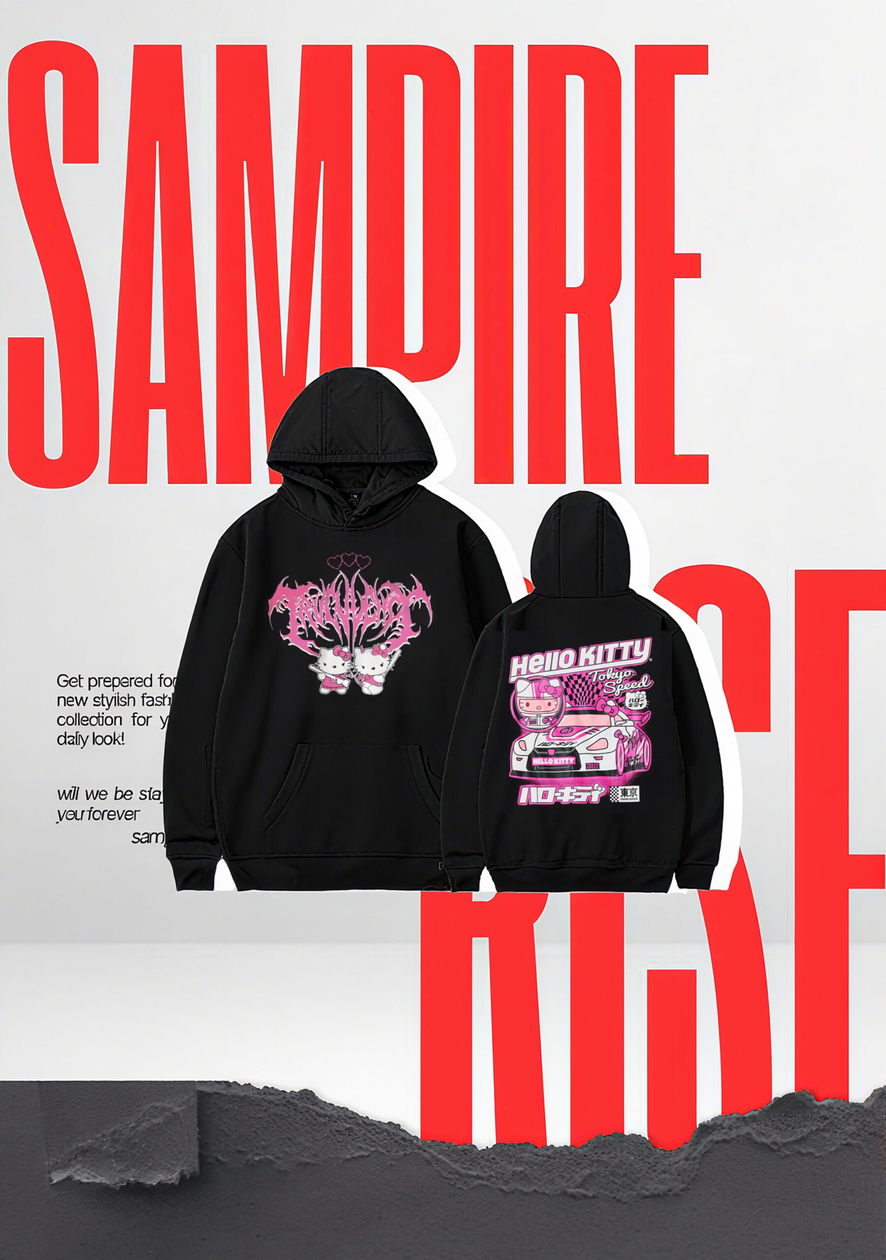 The hoodie is a clash of styles, with a skull on the front and Hello Kitty on the back. It’s a bold mix of cool and cute, perfect for making a statement.