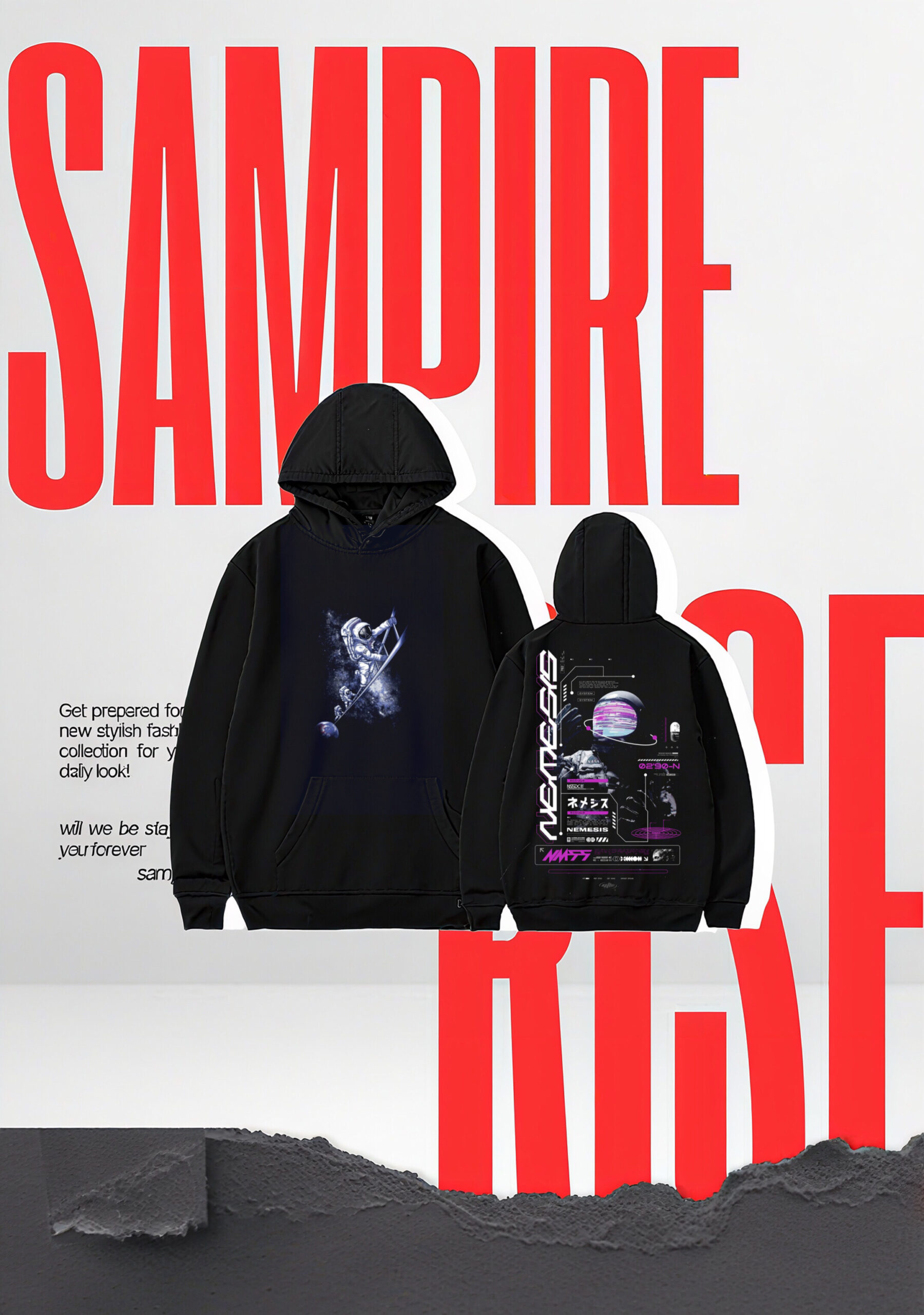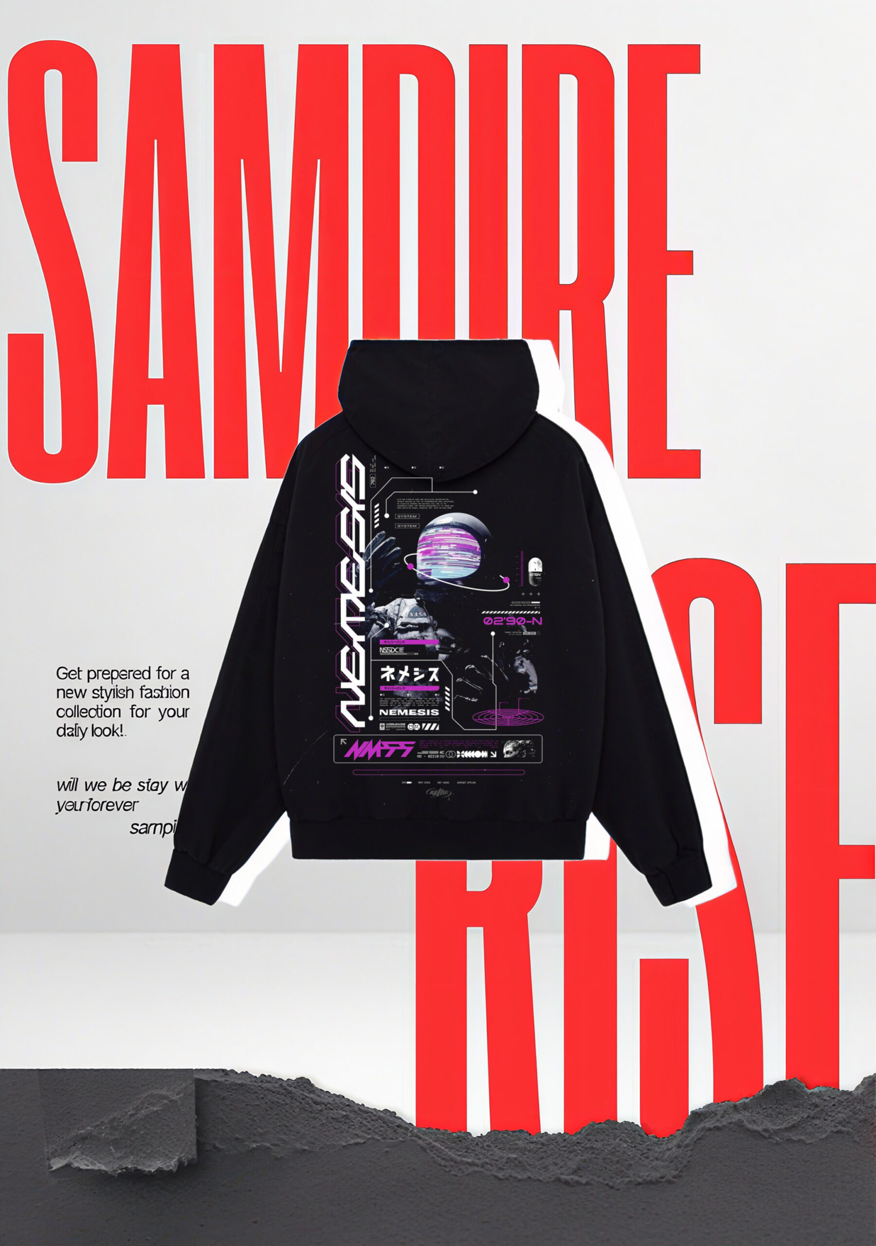 These hoodies feature a striking, futuristic design. One displays “NEMESIS” with a space-themed graphic on the front, while the other offers a similar design on the back, complete with extra details. They’re definitely designed to catch the eye!