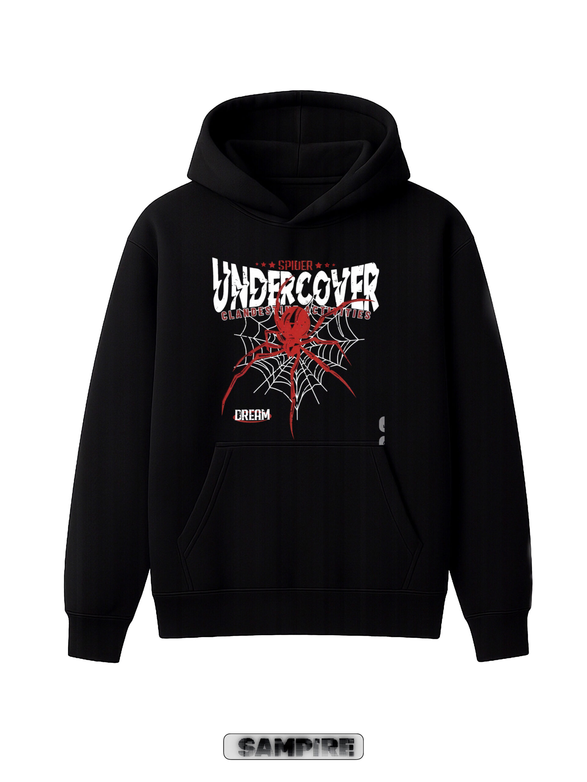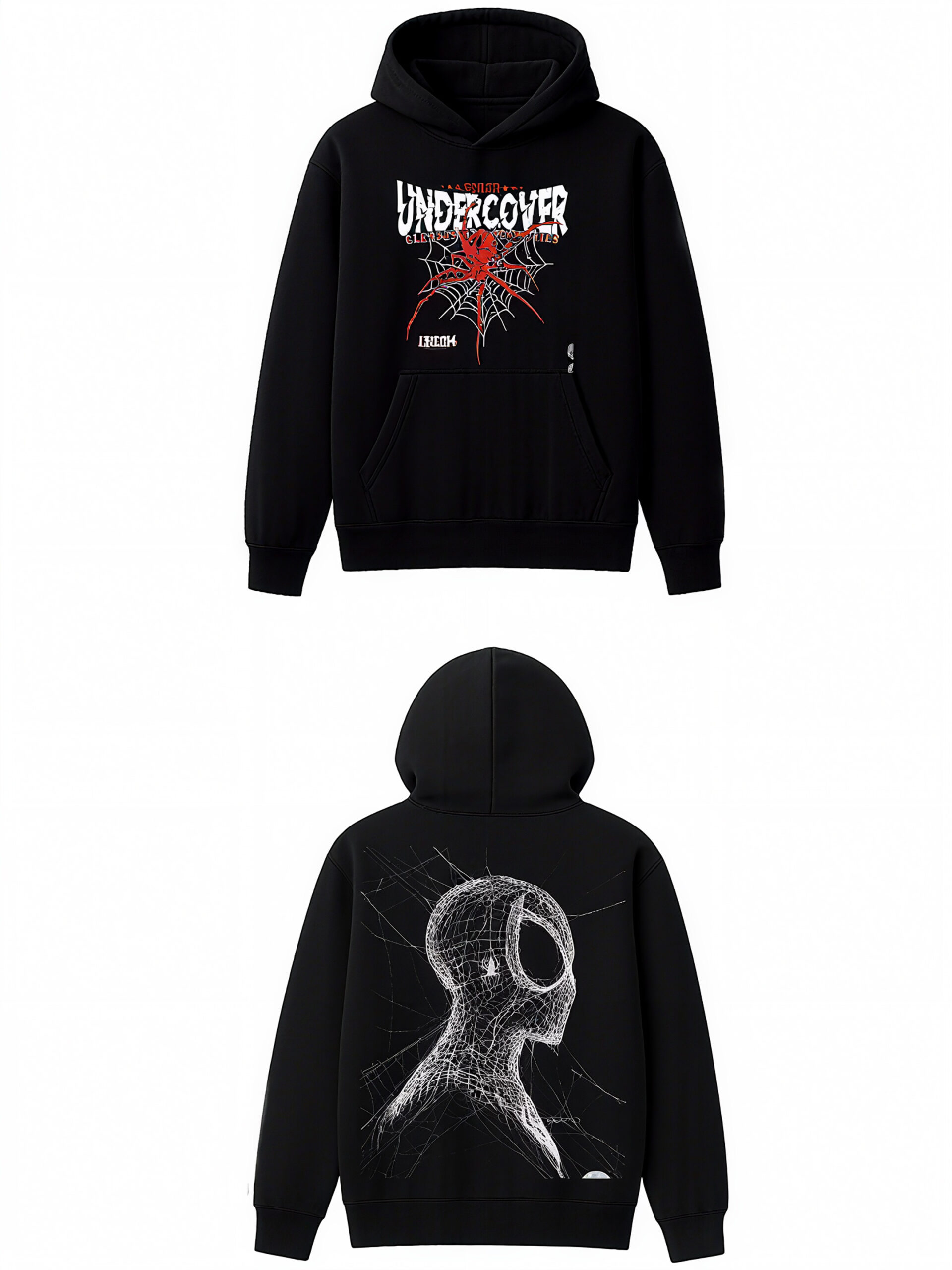 The “UNDERCOVER” hoodie is a standout piece, blending streetwear with superhero flair. The front features a red spiderweb design with the brand name, while the back showcases a Spider-Man illustration. It’s a bold mix that’s sure to turn heads.