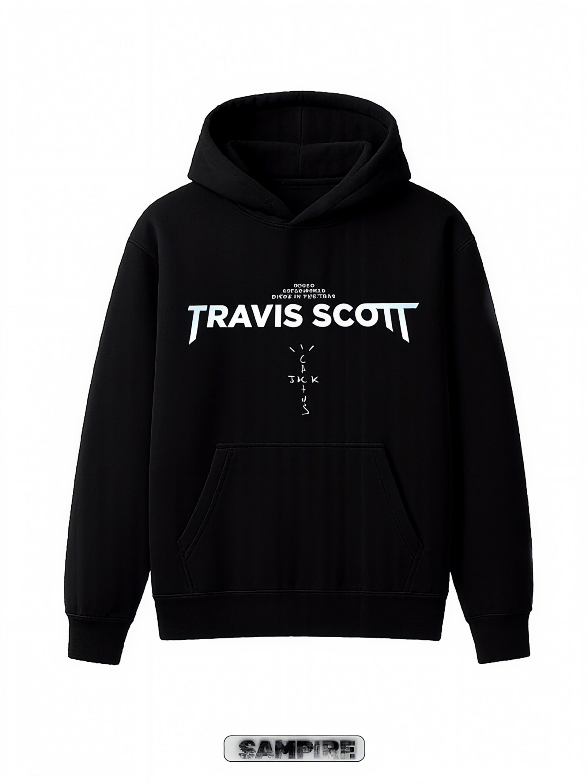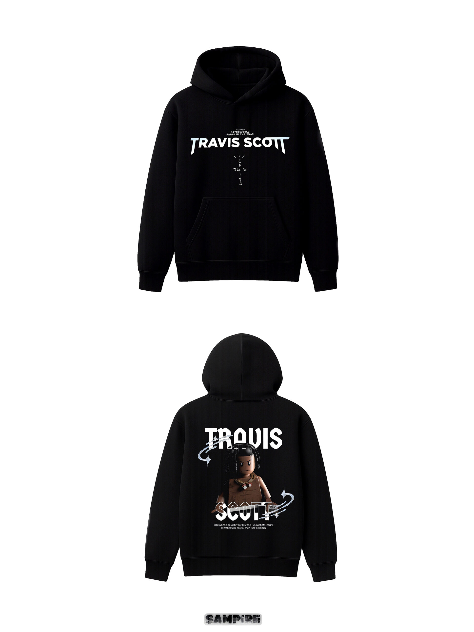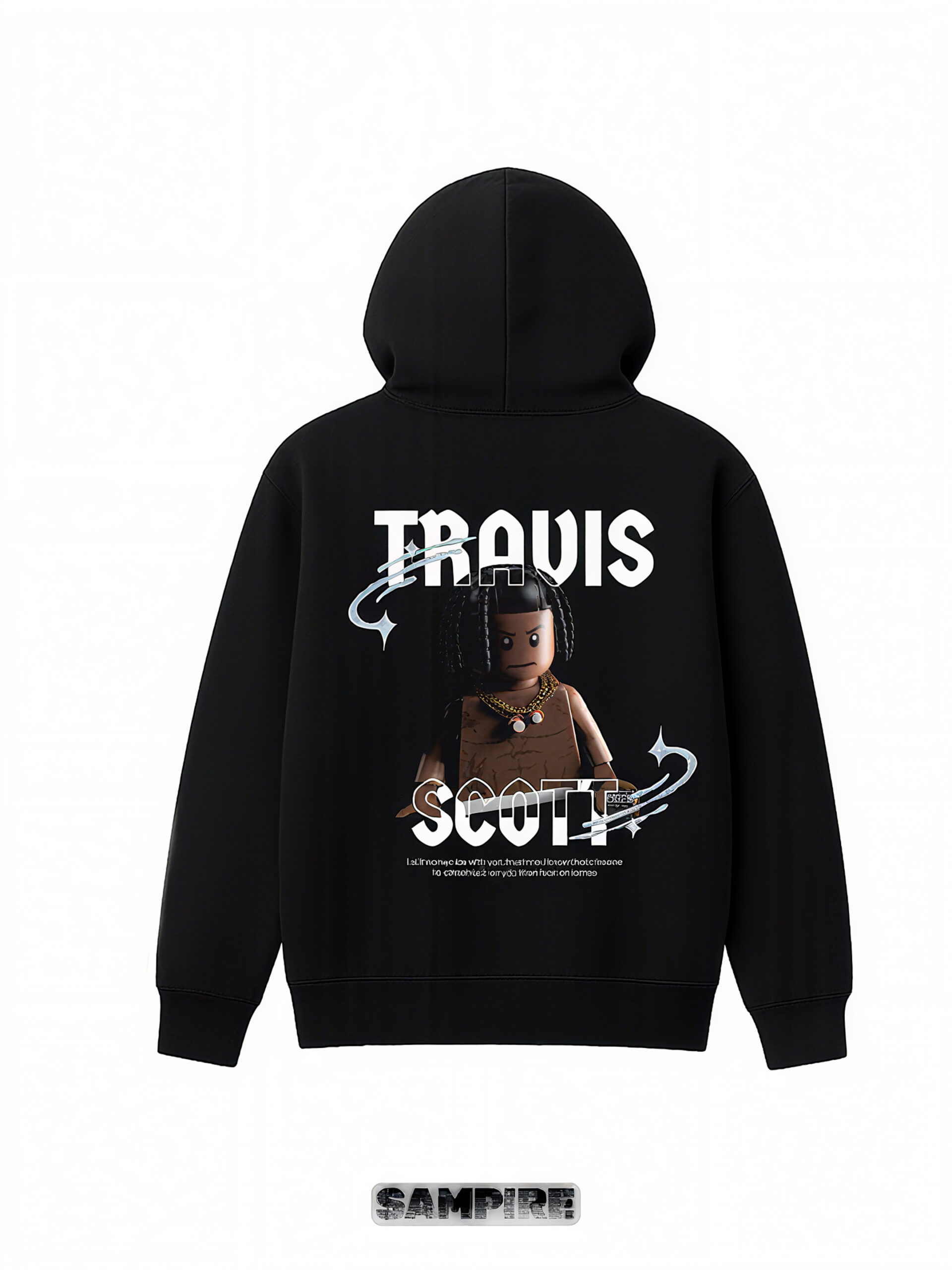 this hoodie showcases a bold design, featuring the name “TRAVIS SCOTT” in a prominent white font on both the front and back. The back also includes a unique Lego-like figure, adding a playful yet stylish element to the design. It’s a great piece for fans!